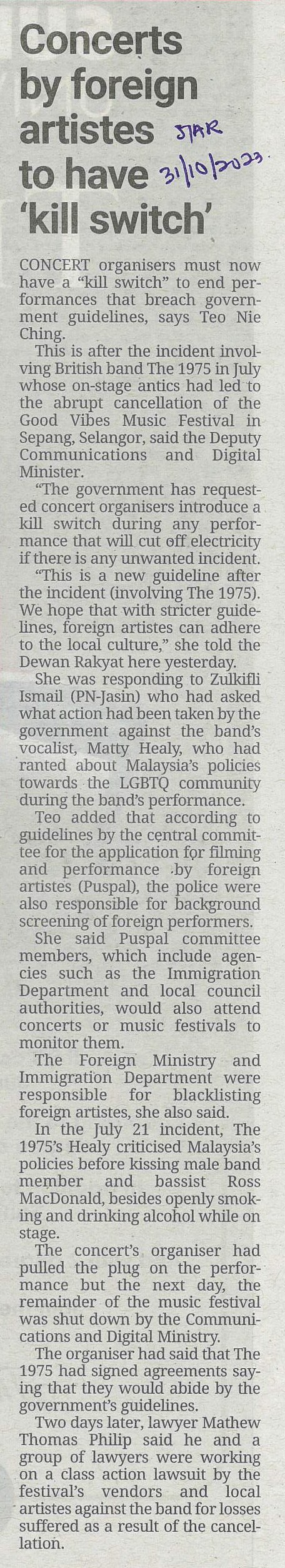 https://repositori.parlimen.gov.my/handle/123456789/1358| Title: | Concerts by foreign artistes to have ‘kill switch’ |