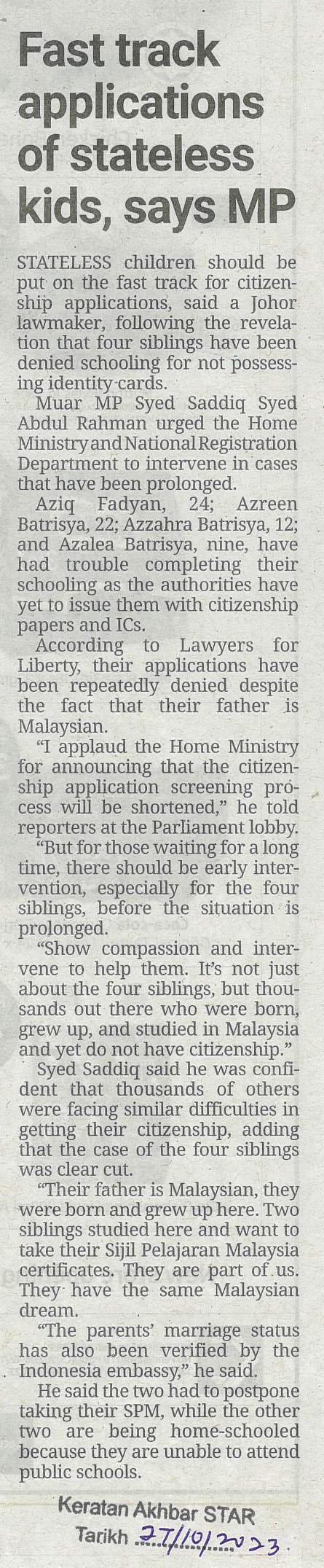 https://repositori.parlimen.gov.my/handle/123456789/1359| Title: | Fast track applications of stateless kids, says MP |