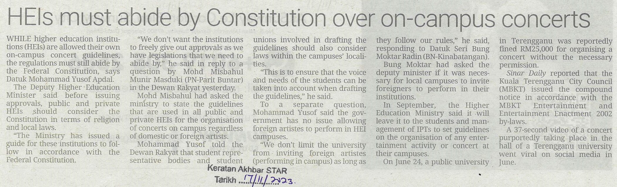 https://repositori.parlimen.gov.my/handle/123456789/1410| Title: | HEIs must abide by Constitution over on-campus concerts |