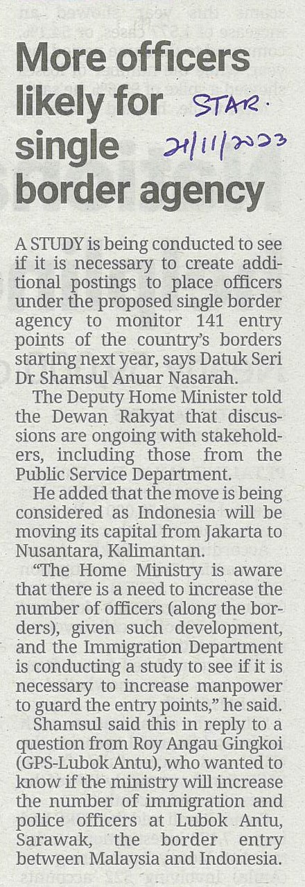 https://repositori.parlimen.gov.my/handle/123456789/1414| Title: | More officers likely for single border agency |