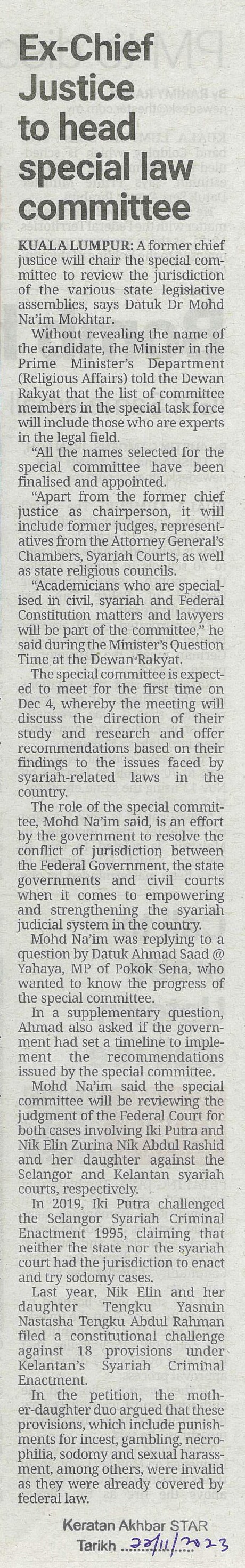 Title: Ex-Chief Justice to head special law committee