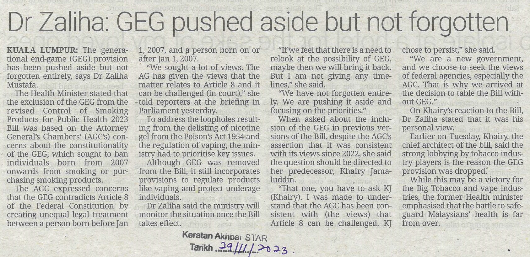 Title: Dr Zaliha: GEG pushed aside but not forgotten