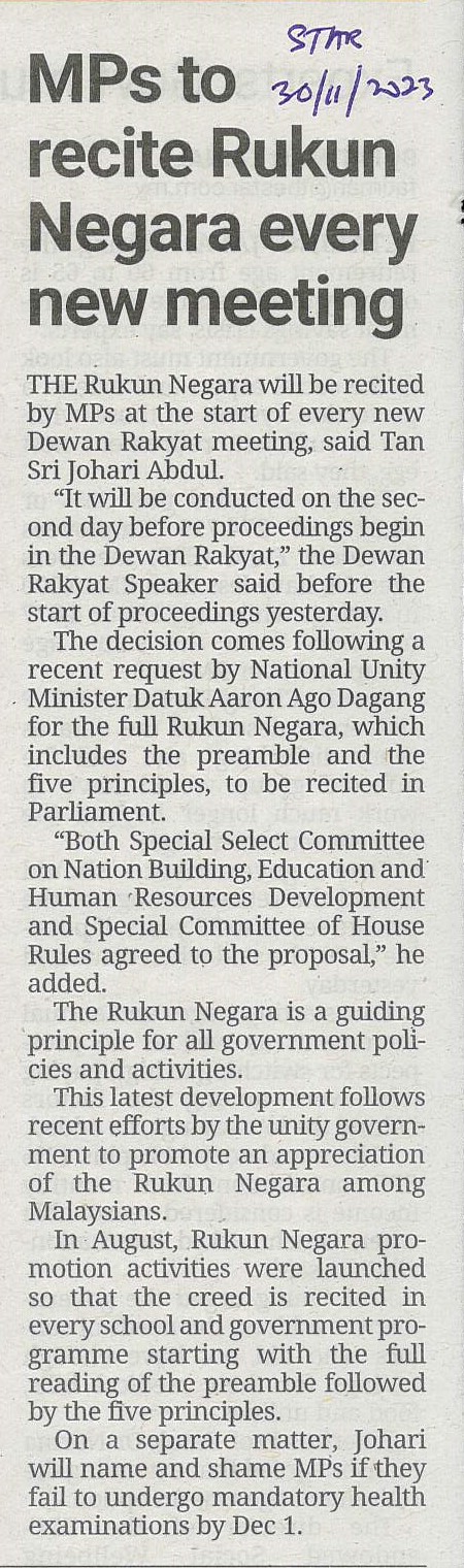 | MPs to recite Rukun Negara every new meeting.jpg | MPs to recite Rukun Negara every new meeting | 288.57 kB | JPEG | View/Open |
