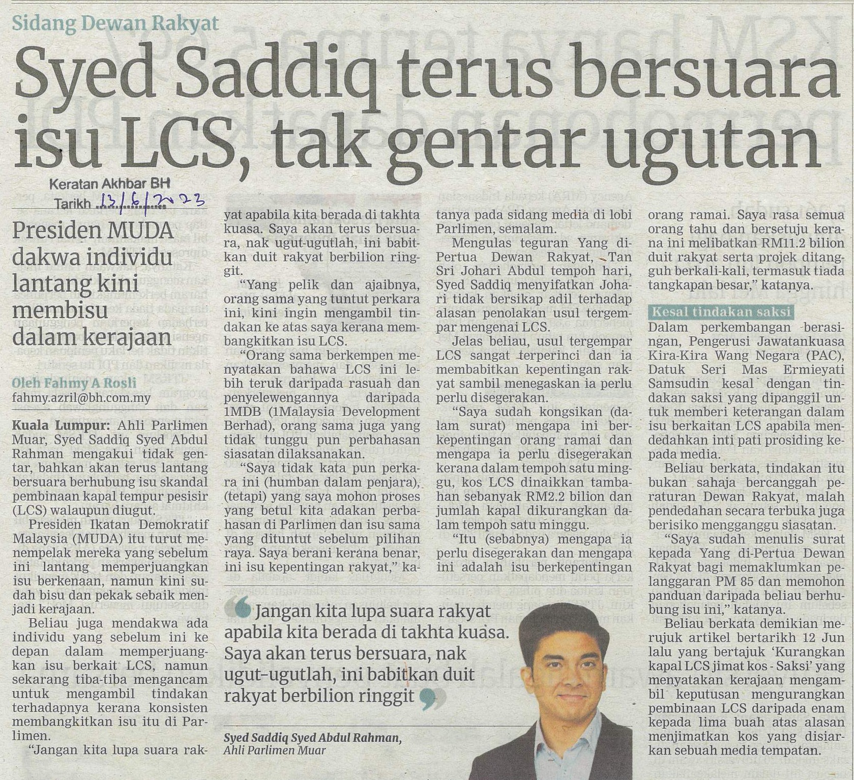 https://repositori.parlimen.gov.my/handle/123456789/2763| Title: | Syed Saddiq terus bersuara isu LCS, tak gentar ugutan |