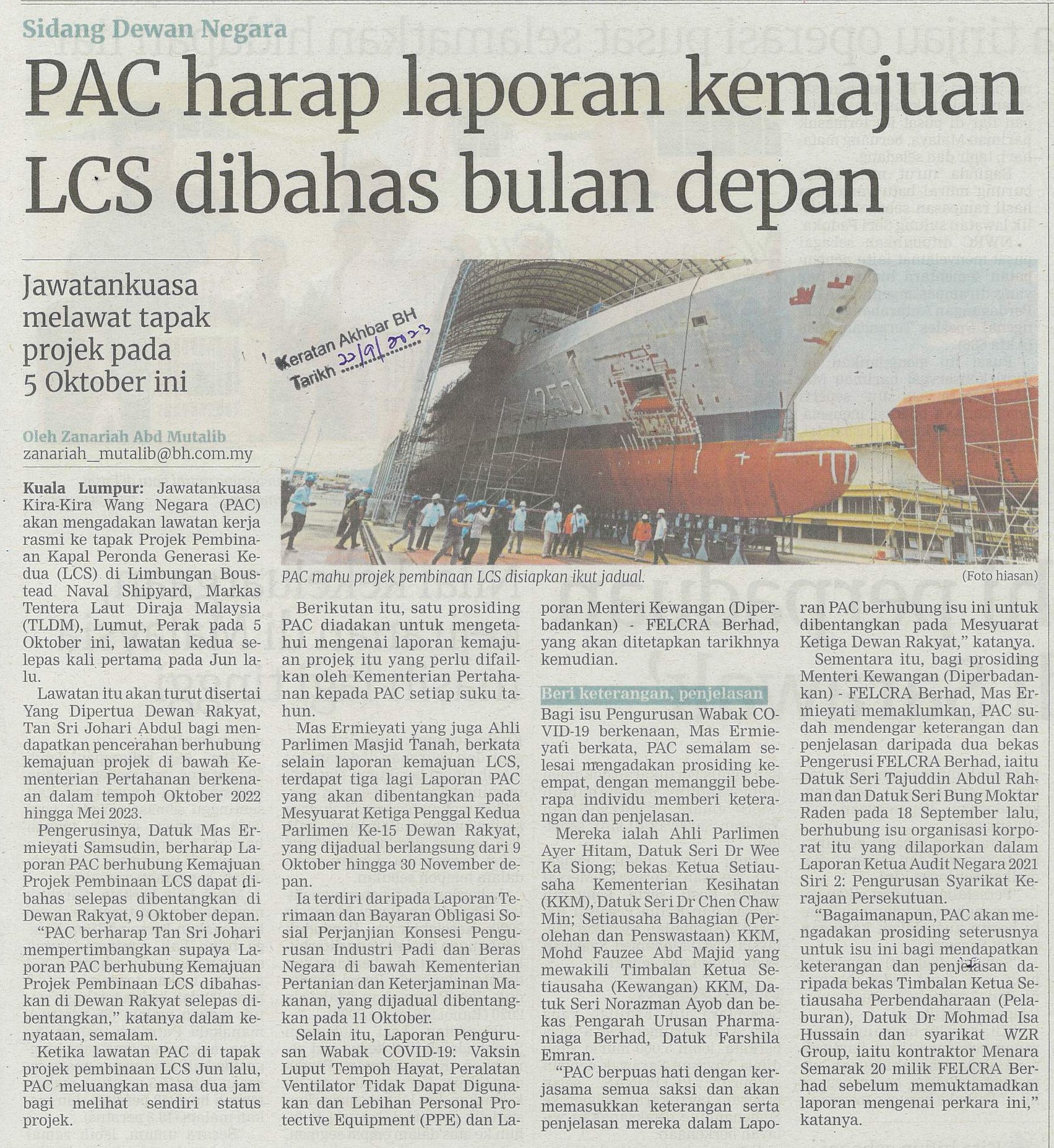 https://repositori.parlimen.gov.my/handle/123456789/2907| Title: | PAC harap laporan kemajuan LCS dibahas bulan depan |