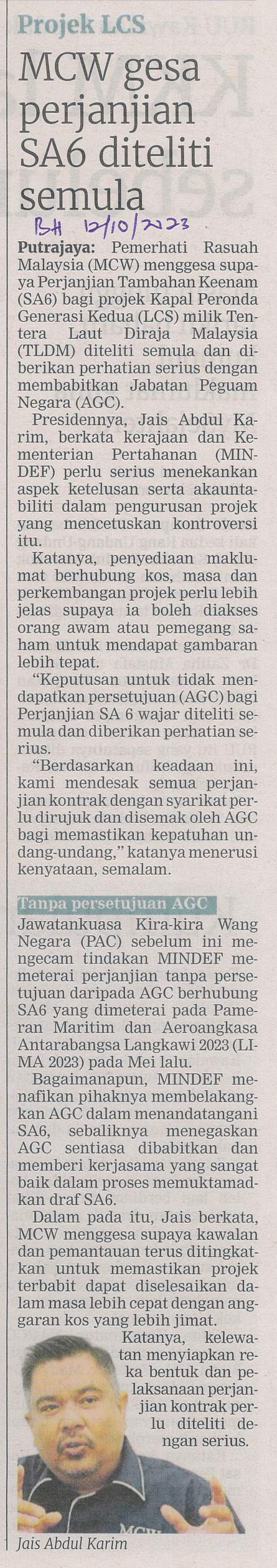 Title: MCW gesa perjanjian SA6 diteliti semula