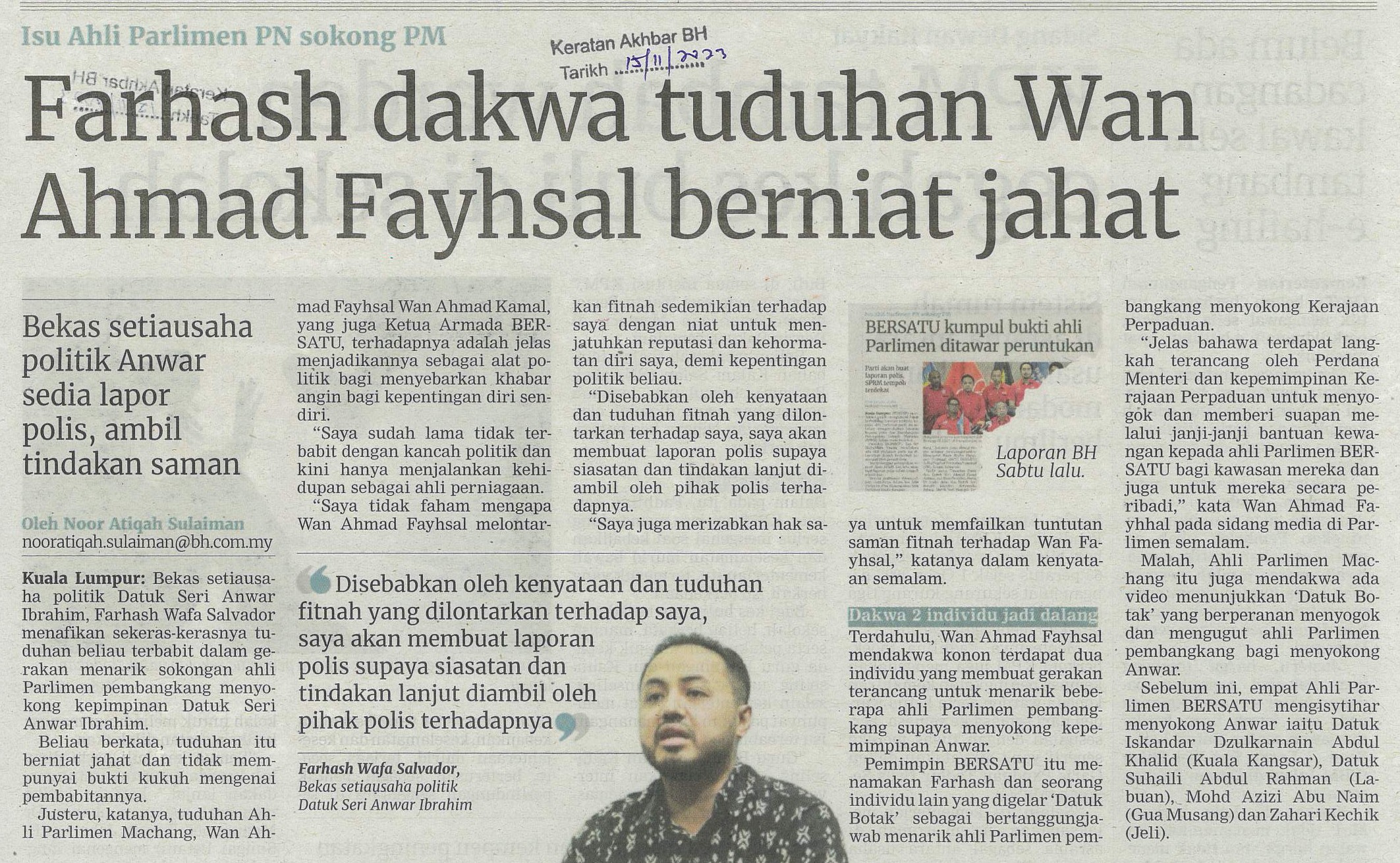https://repositori.parlimen.gov.my/handle/123456789/3143| Title: | Farhash dakwa tuduhan Wan Ahmad Fayhsal berniat jahat |