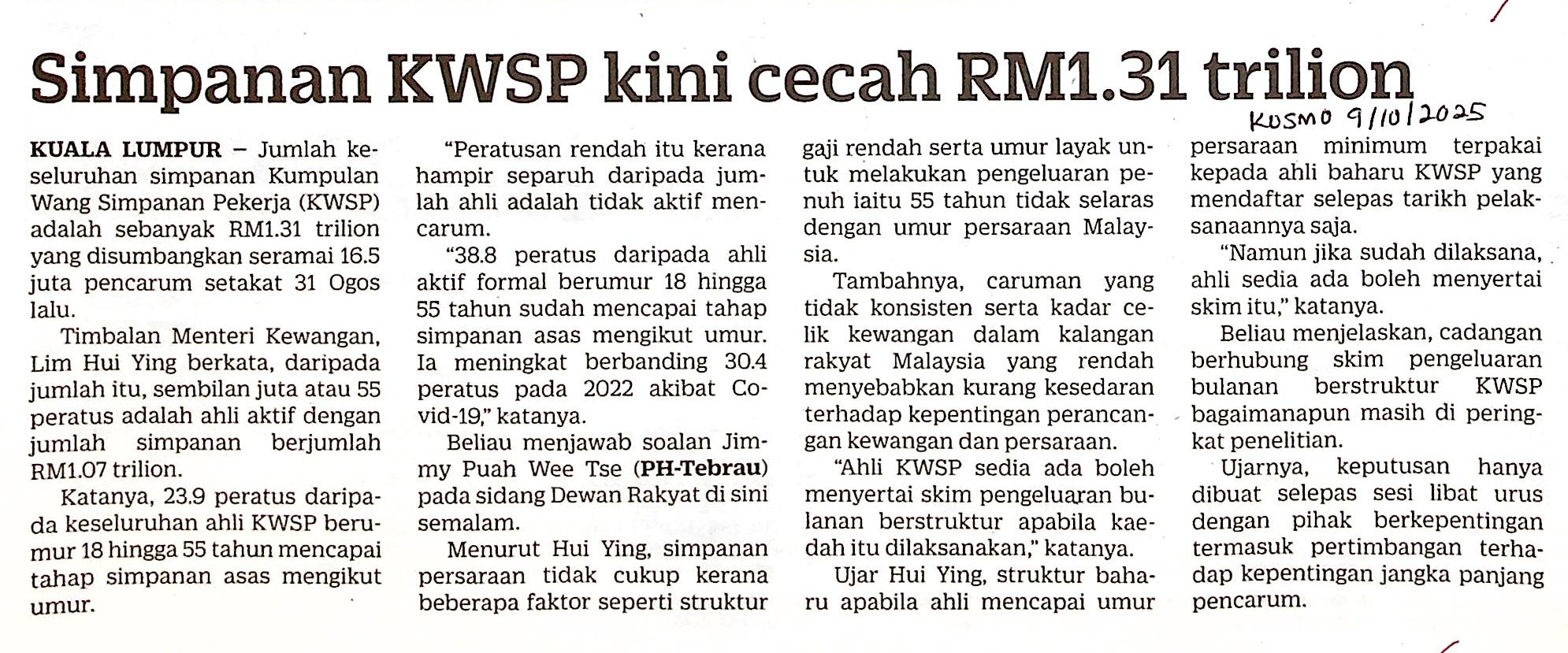 https://repositori.parlimen.gov.my/handle/123456789/3666| Title: | SIMPANAN KWSP KINI CECAH RM1.31 TRILION |