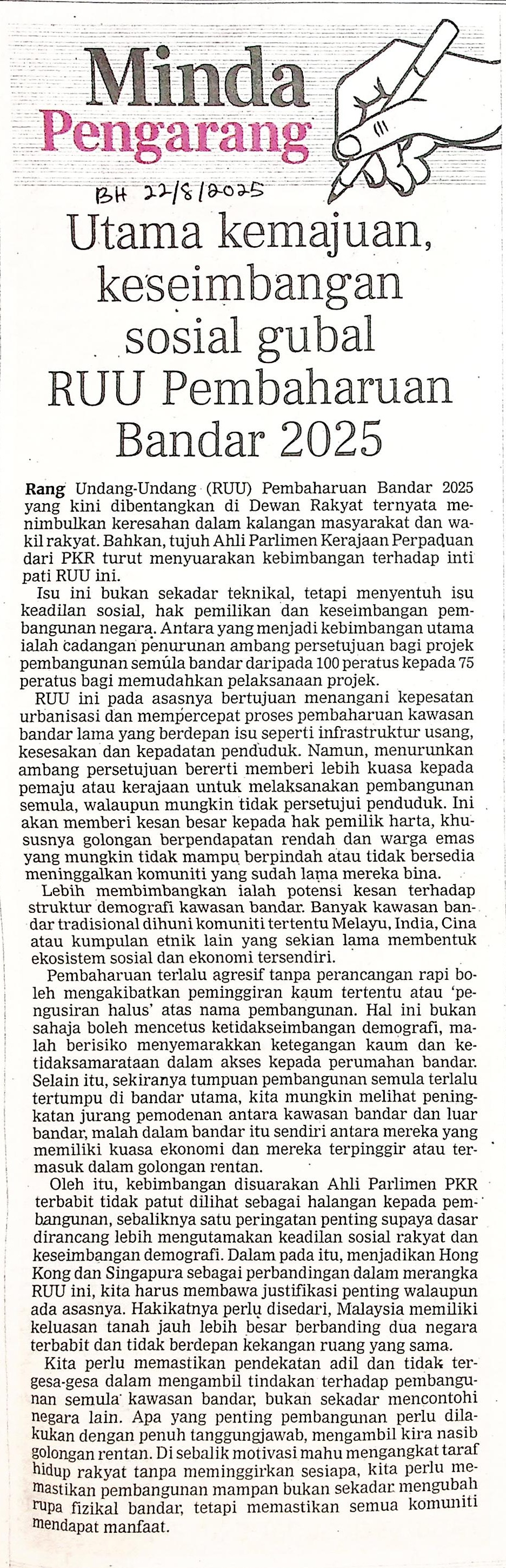| BH 22.08 (7).jpg | UTAMA KEMAJUAN, KESEIMBANGAN SOSIAL GUBAL RUU PEMBAHARUAN BANDAR 2025 | 992.83 kB | JPEG | View/Open |