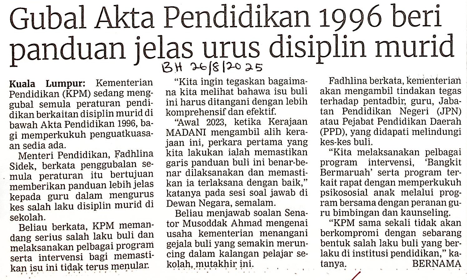 | BH 26.08 (3).jpg | GUBAL AKTA PENDIDIKAN 1996 BERI PANDUAN JELAS URUS DISIPLIN MURID | 494.16 kB | JPEG | View/Open |