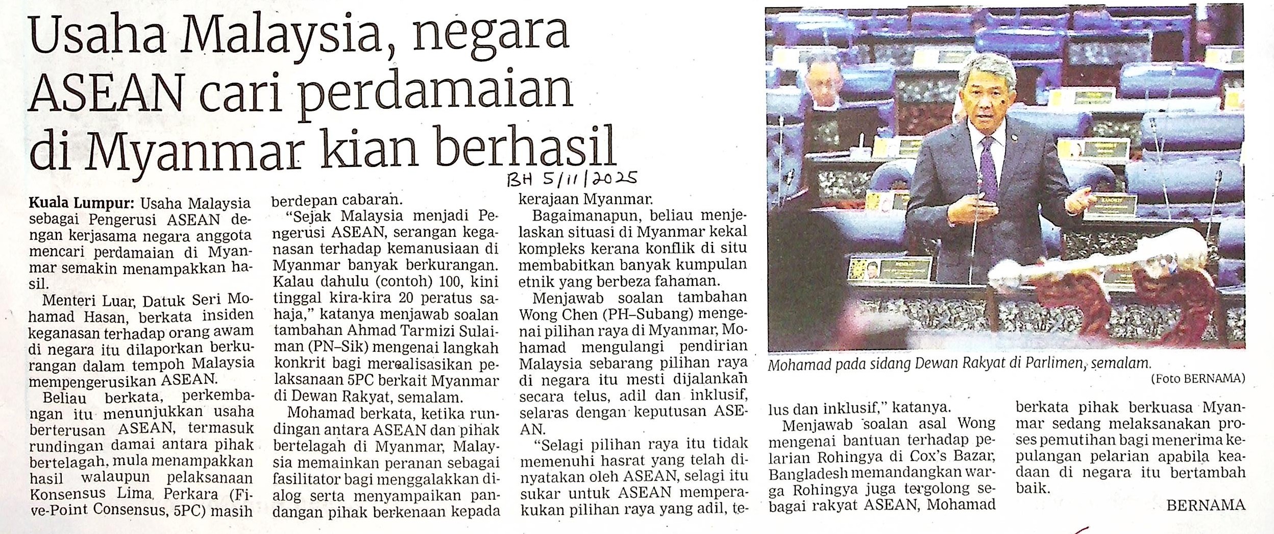 | BH 5.11.25 (5).jpg | USAHA MALAYSIA, NEGARA ASEAN CARI PERDAMAIAN DI MYANMAR KIAN BERHASIL | 906.88 kB | JPEG | View/Open |