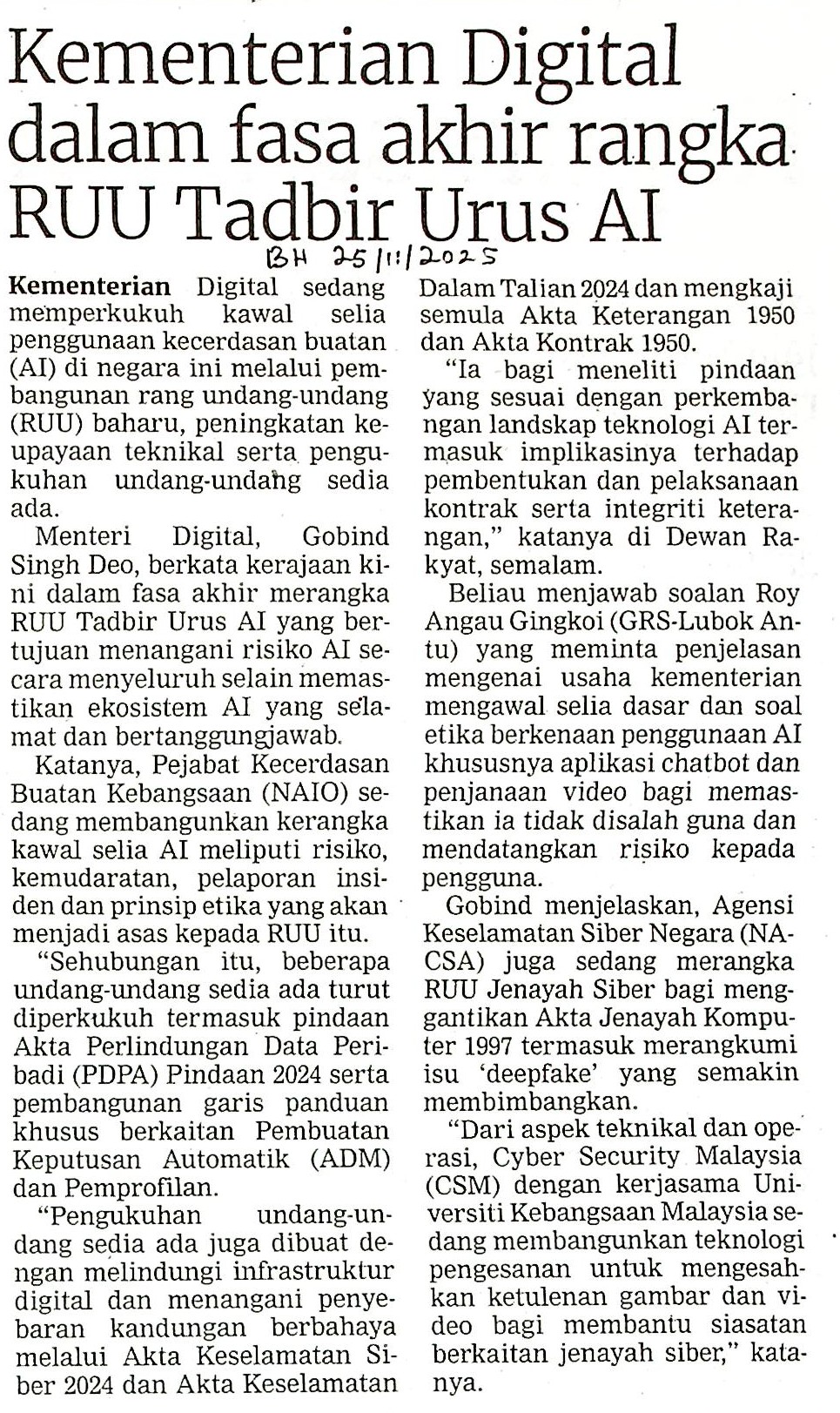 | BH 25.11.25 (4).jpg | KEMENTERIAN DIGITAL DALAM FASA AKHIR RANGKA RUU TADBIR URUS AI | 637.22 kB | JPEG | View/Open |